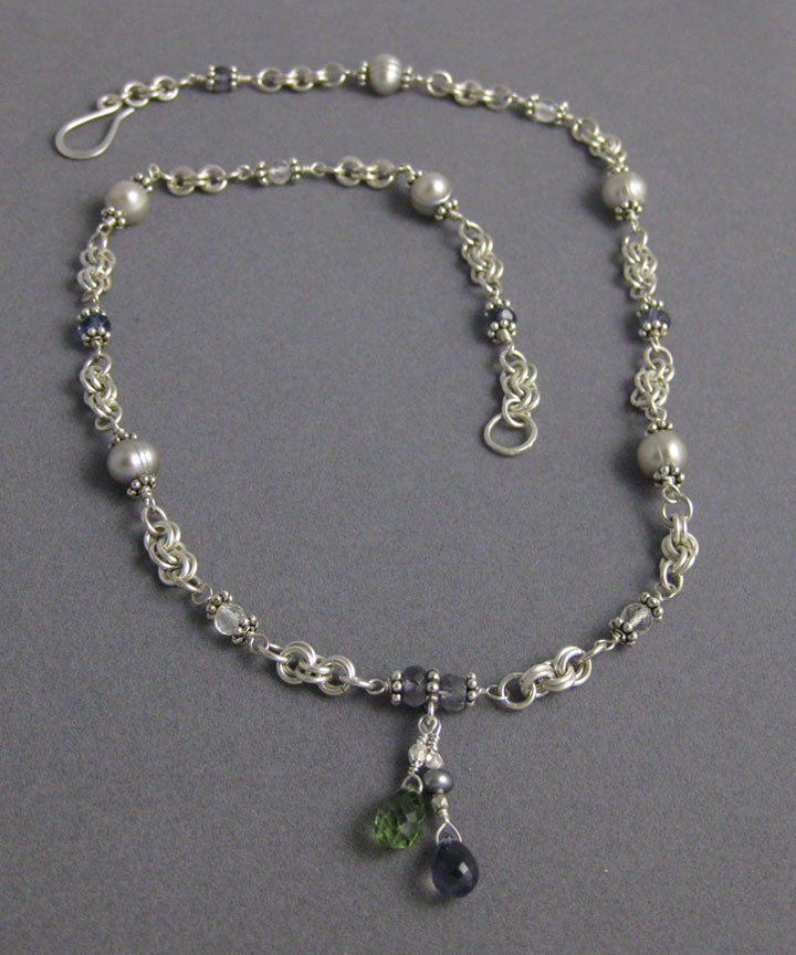This Argentium sterling silver chain is simple and elegant. It combines interlinked silver rings with clear quartz and iolite faceted round beads and gray pearls. The pendant features iolite and apatite briolettes. The clasp is sterling silver. This chain is very supple and has a nice feel.