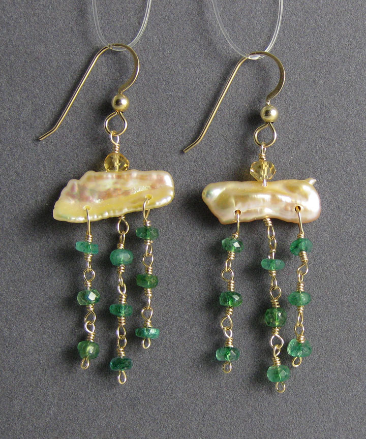 In these earrings, sparkly green, dyed topaz drops hang from a peach cultured freshwater pearl.