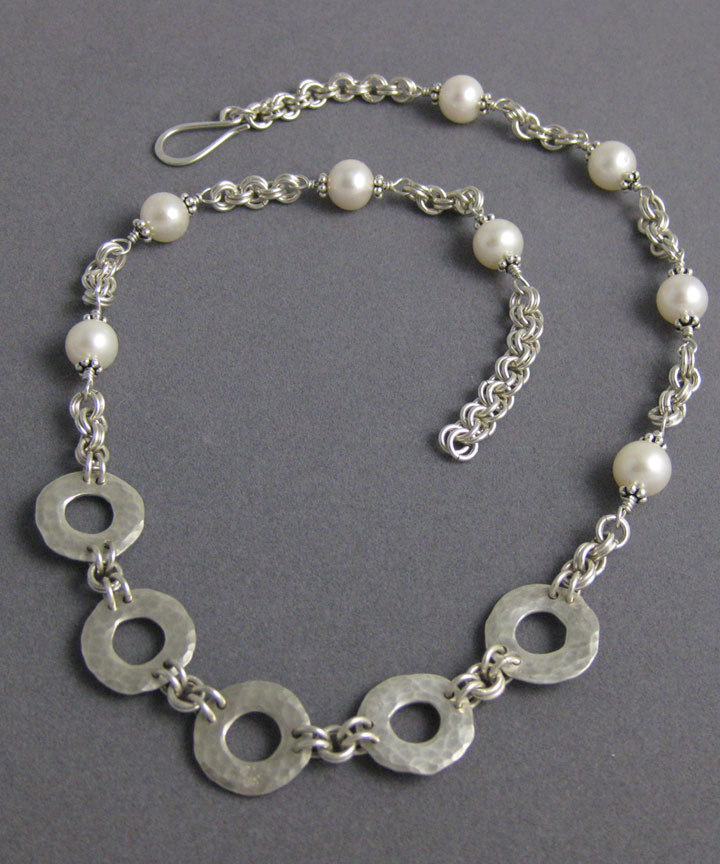 This substantial chain showcases 5 large hammered Argentium sterling silver disks. The chain alternates doubled links with white cultured freshwater pearls.