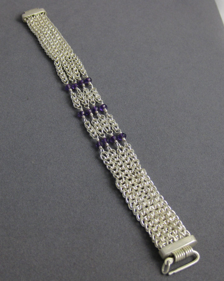 This bracelet combines two ancient chain styles, single loop-in-loop and a single mesh. Bright purple amethysts accent the fine silver wire.