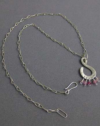 This hammered pendant has a suite of pinkish tourmalines, ranging from light pink to dark magenta. The chain is sterling silver.