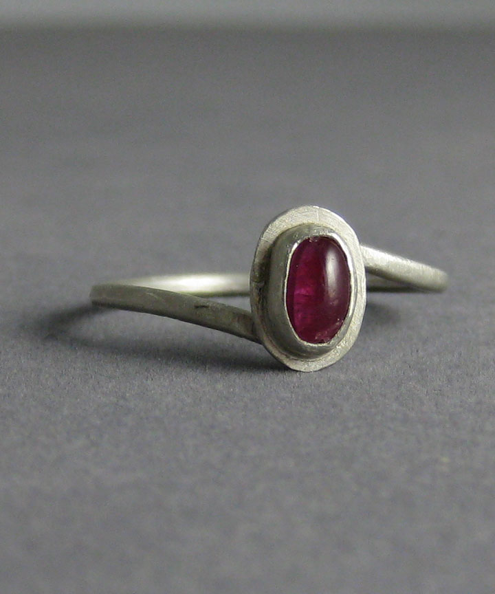 This delicate ring has a translucent ruby cabochon in an Argentium sterling silver setting with a matte finish. Size 7.