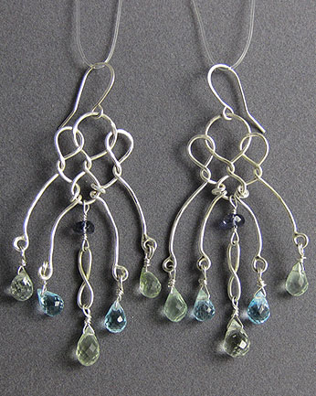 These dangly earrings are made of long intertwined silver wires. Blue topaz and green beryl gems dot the end of the wires.