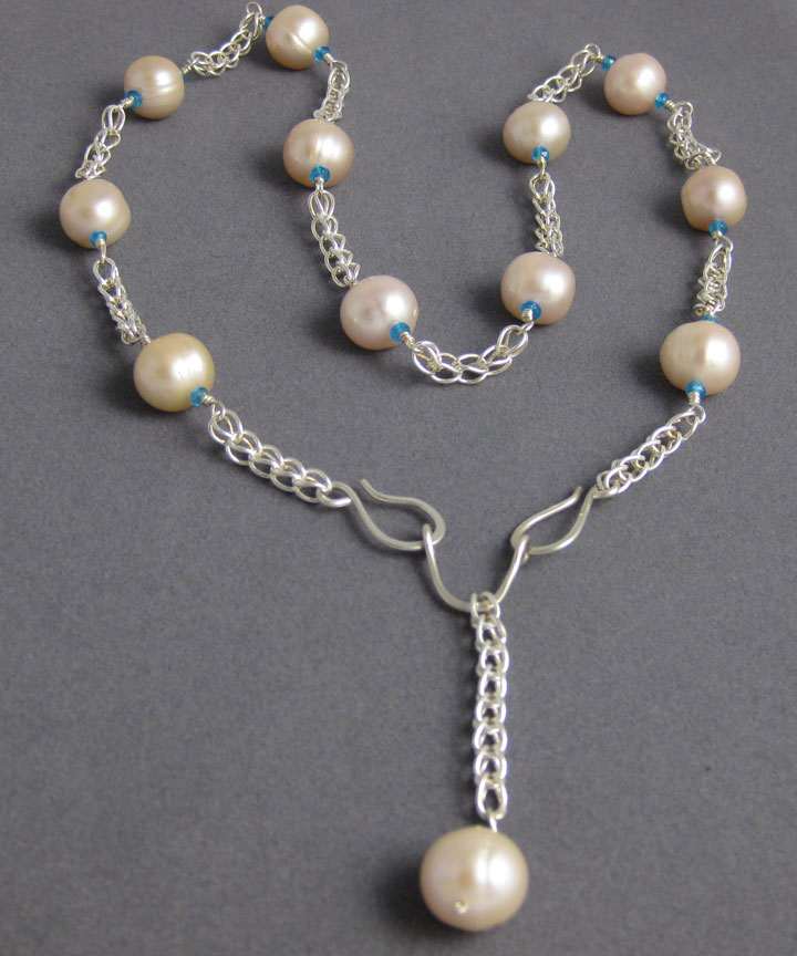 This pearl necklace alternates pink cultured freshwater pearls with fine silver chain. Neon blue apatite gems accent the pink pearls. The pendant is removable.