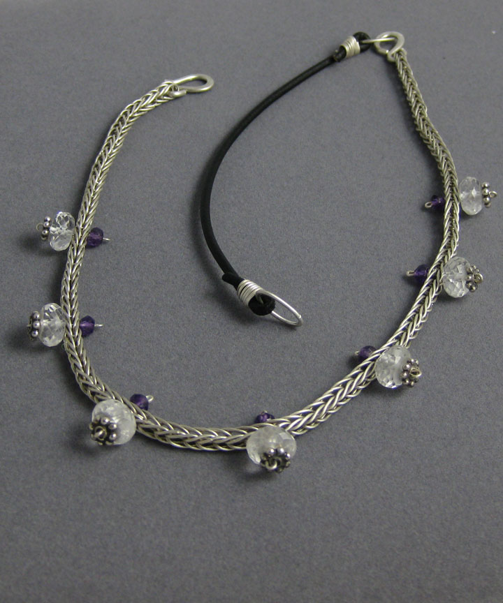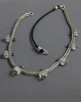 This woven silver neckpiece is dotted with synthetic colorless sapphires and amethyst beads. The back portion of the necklace is leather cord.