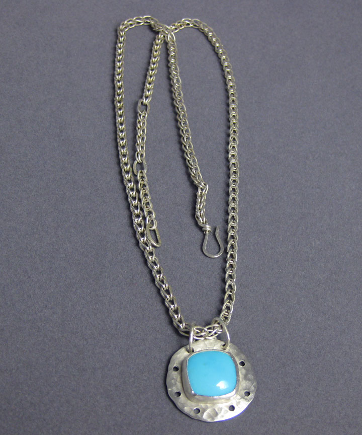 This pendant showcases a bright blue turquoise cabochon in an Argentium sterling silver setting. The chain has delicate twisted links.