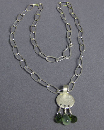 This pendant features a hammered Argentium sterling silver disk. Hanging from the disk are 3 gemstones: two dark green apatite briolettes and one page green prehnite smooth drop. The pendant is hanging from a fine silver single loop-in-loop chain.
