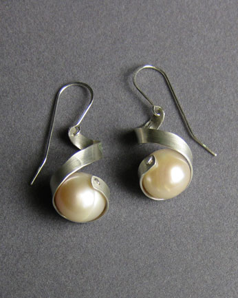 In these simple, elegant earrings, a large natural-color cultured freshwater pearl is wrapped in a silver metal spiral.