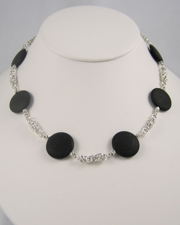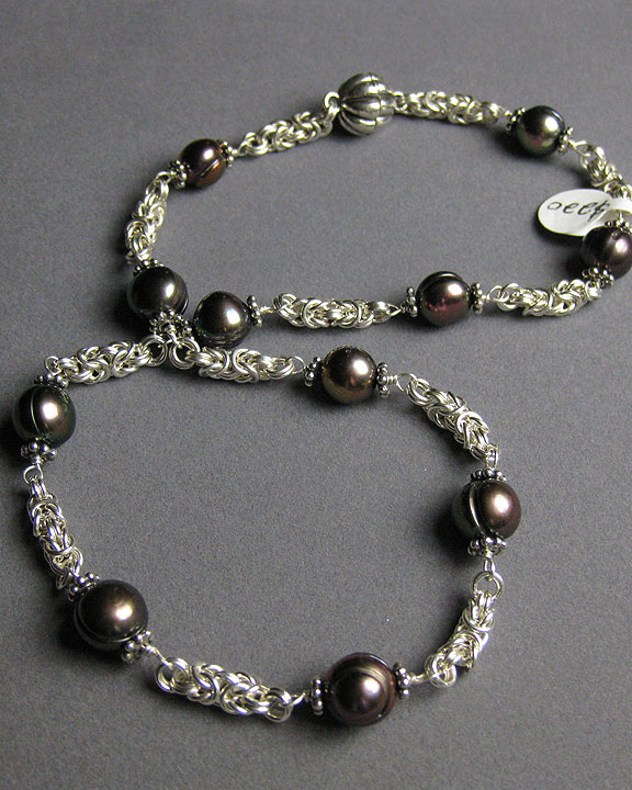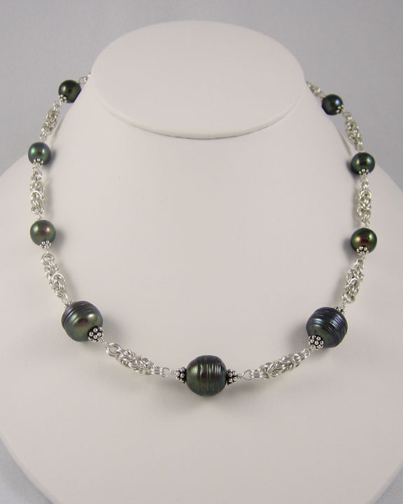 This classic design pairs peacock black cultured freshwater pearls with a handmade chain n the Byzantine pattern. Sterling silver beads accent the pearls.