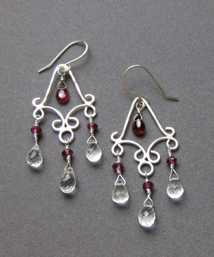 These triangular chandelier earrings showcase a smooth red spinel drop in the center and rhodolite garnet beads with colorless topaz briolettes.